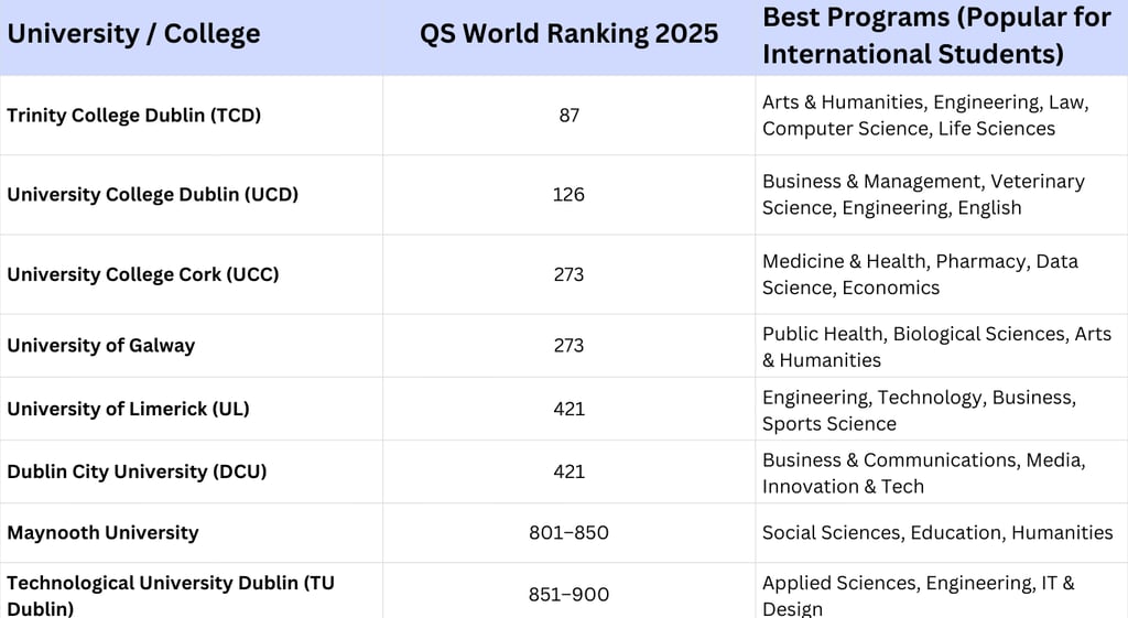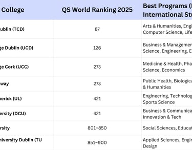 This table helps Bangladeshi and other international students compare Ireland’s top universities, their global rankings, and best-fit programs — making it easier to plan study and career goals in Ireland.