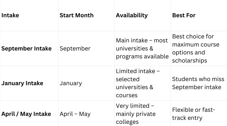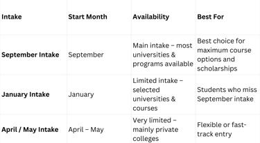 Most Bangladeshi and international students prefer the September intake due to wider course choices and better alignment with post-study work opportunities. However, other intakes also provide excellent options for students who need additional time for exams, documentation, or visa processing.