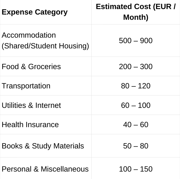Student Visa Living Cost Requirement: Approx. EUR 10,000 per year