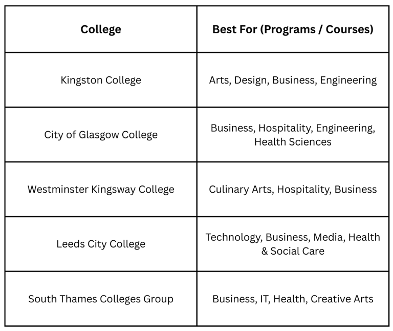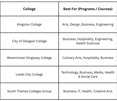 Note: Colleges offer diplomas, advanced diplomas, and pathways to universities or careers in UK